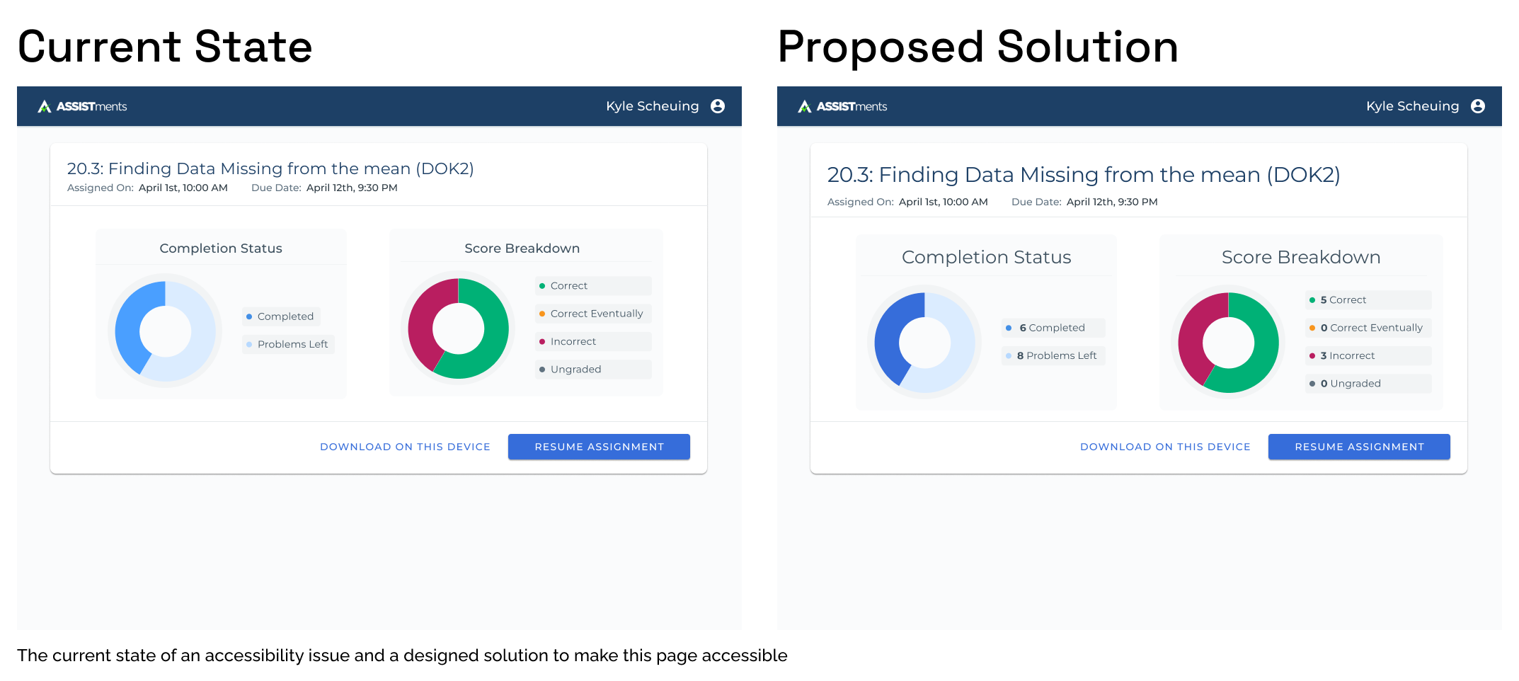 ASSISTments is an math ed-tech non-profit which supports students’ understanding of math and gives teachers detailed reports on where students are struggling. They are a grant-funded and as a result of recently passed legislation, they need to be accessible for students in order to be adopted by school district partners. I led this project, which included a team of designers and software testing engineers.