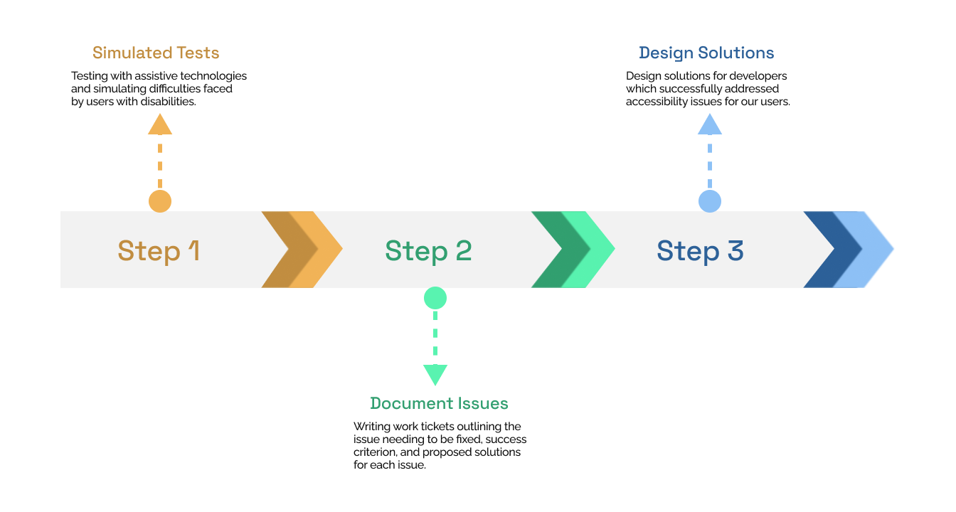 After the report and testing was finished, I wrote JIRA tickets to serve as a roadmap for our engineering team to fix critical accessibility issues. Along with writing the tickets, I designed solutions when I needed to that would appropriately address the accessibility issue to meet the WCAG success criterion.